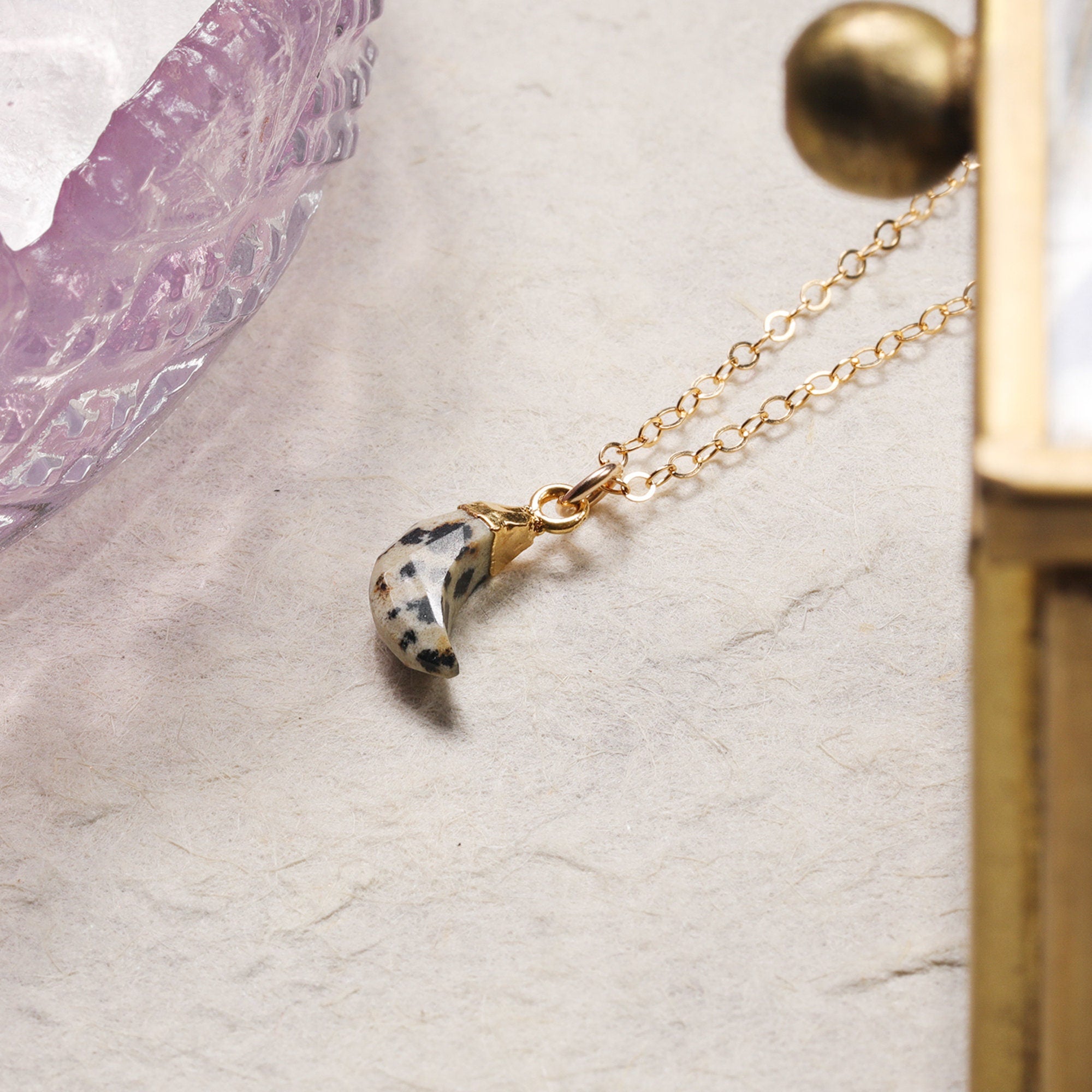 Dalmatian Jasper Necklace - Genuine jasper Mini Moon Pendant on 14k Gold Filled chain - Unique boho necklace - Birthday gift idea for her