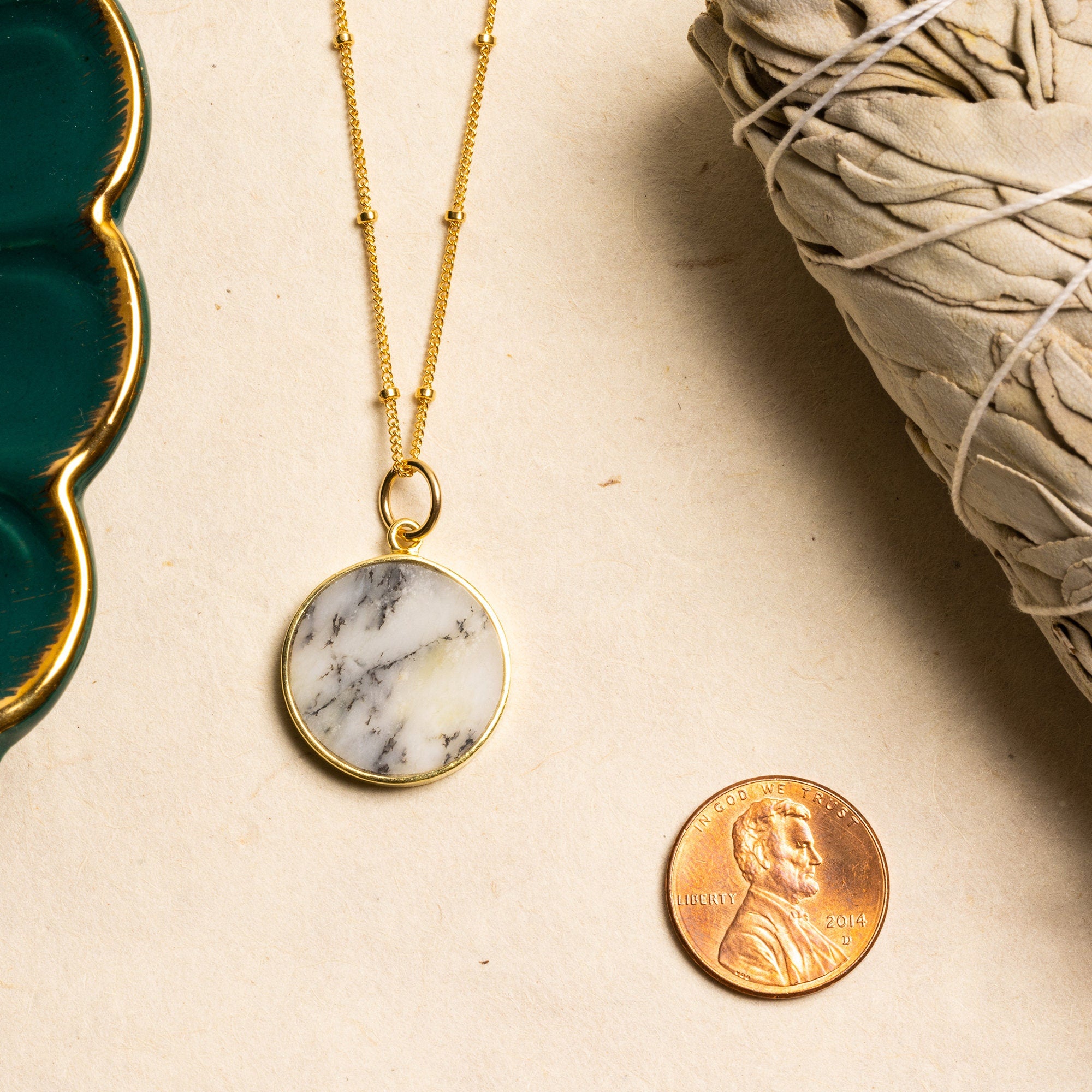 Dendrite Opal Circle Necklace - Round slice of genuine Dendrite Opal gemstone bezel in vermeil gold on 14k gold filled satellite chain - Gifts for her
