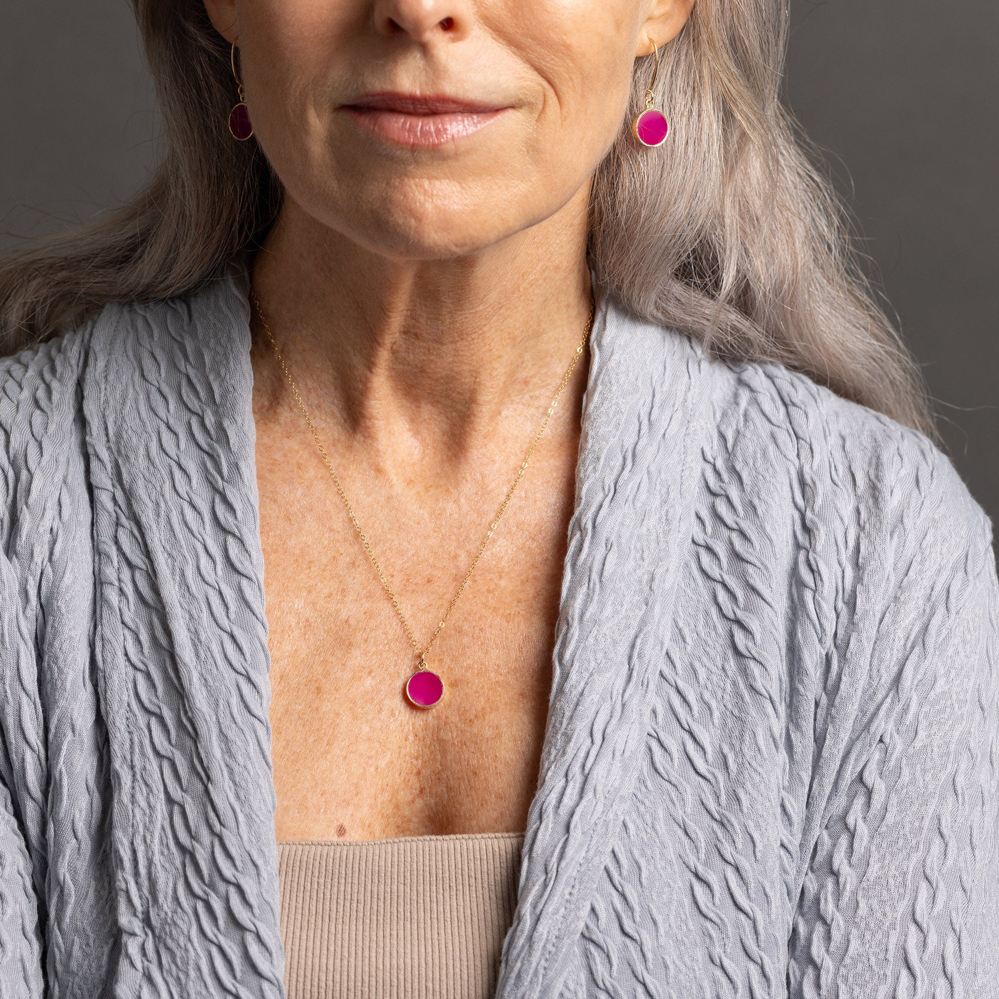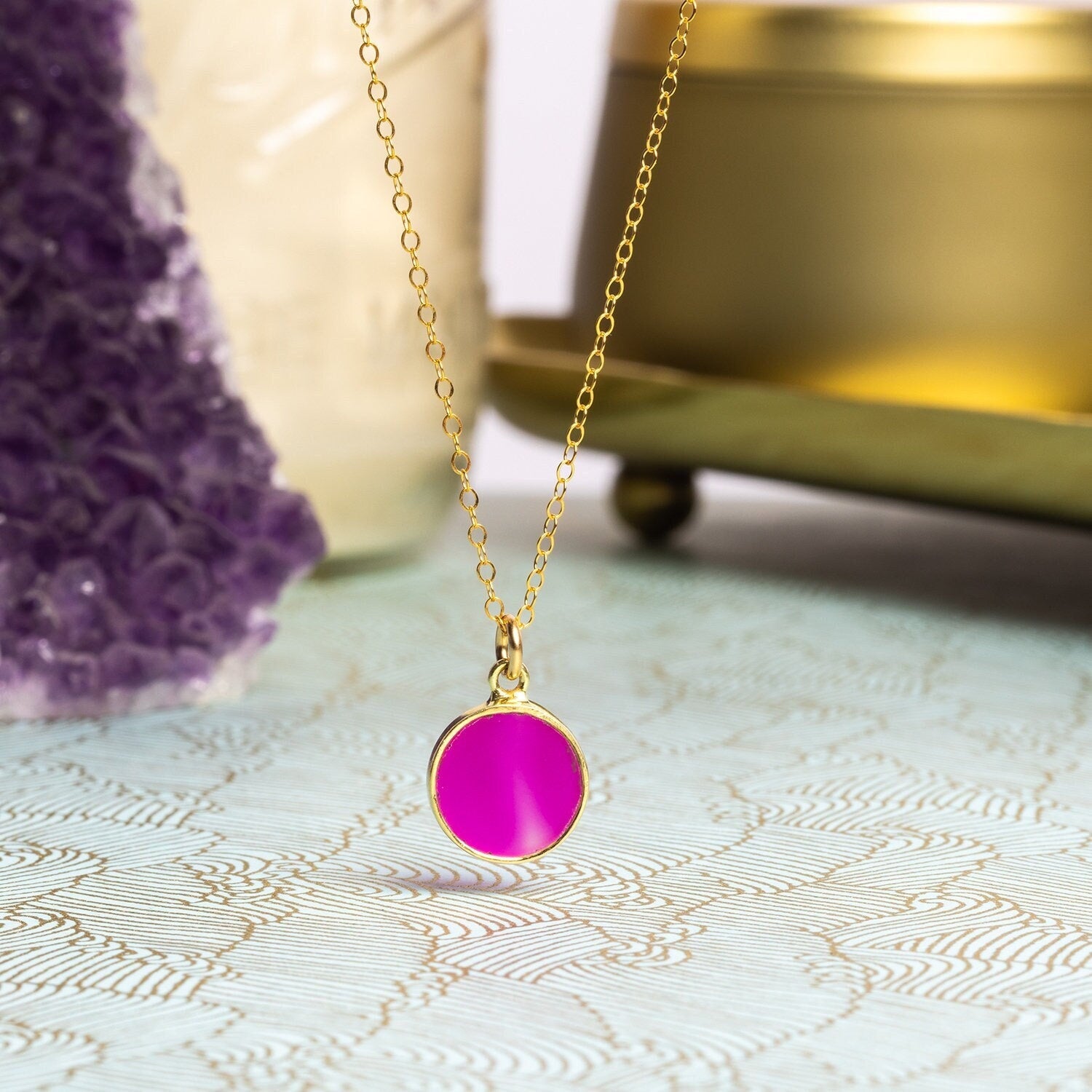 Fuchsia Chalcedony Gold Round Pendant Necklace - Minimalist, modern bright pink gemstone necklace - Jewelry gifts for Mom, grandma, wife.