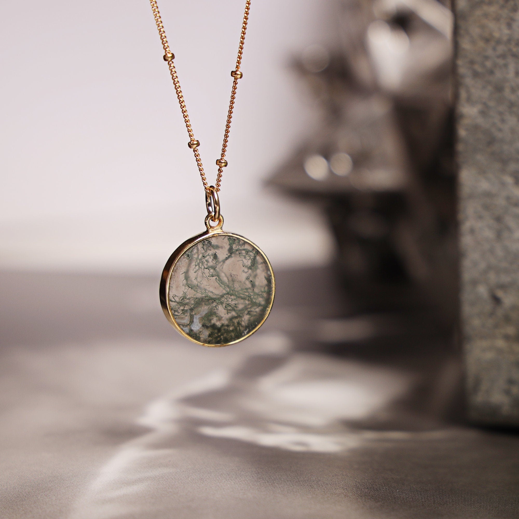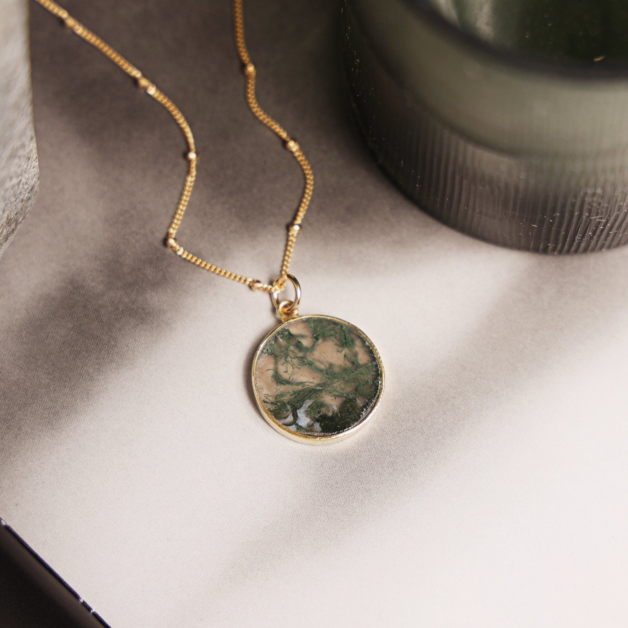 Moss Agate Gold Disc Pendant Necklace (Satellite Chain)