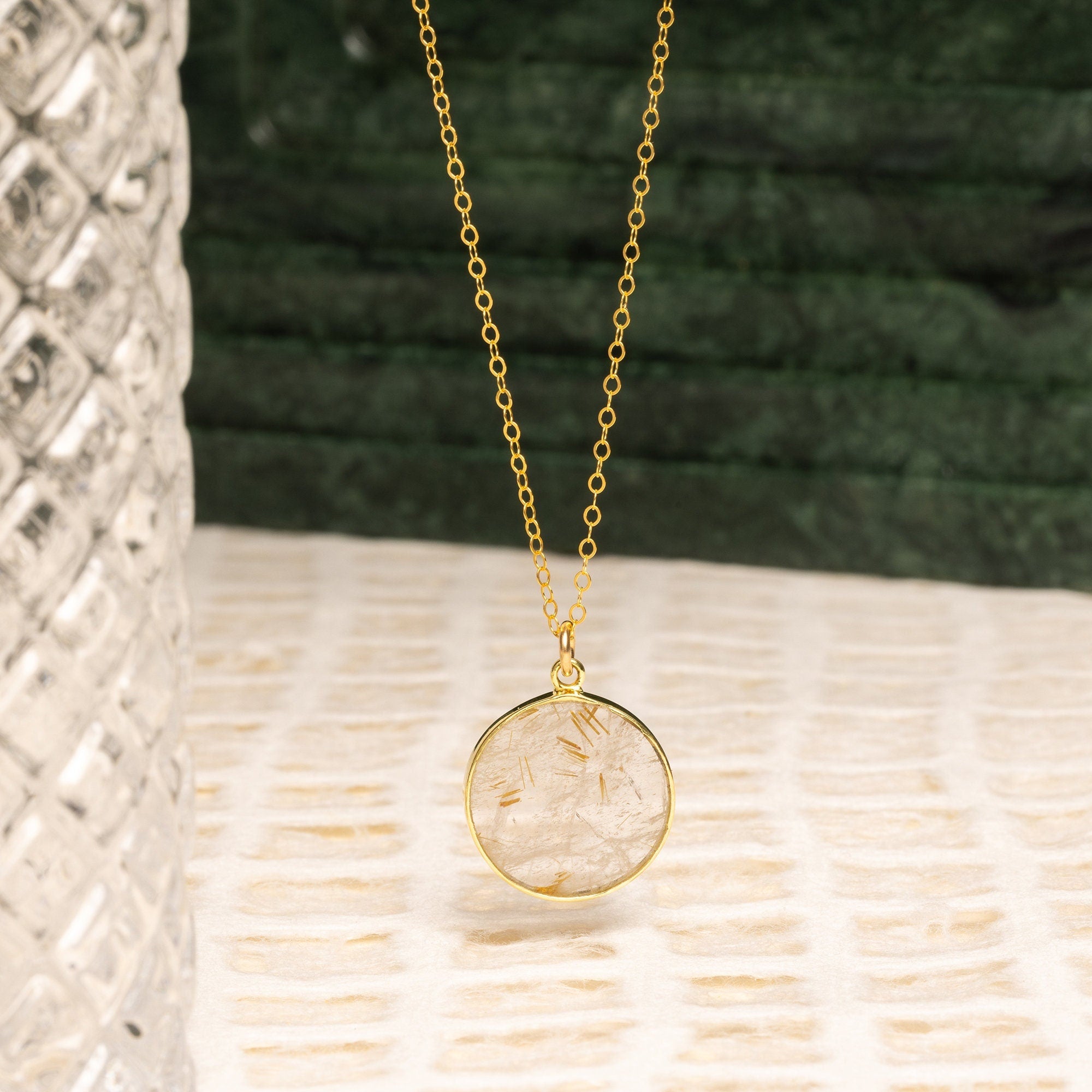 Golden Rutilated Quartz Circle Round Pendant on 14k Gold Filled dainty cable chain - Minimalist Jewelry gifts for her, mom, wife and you