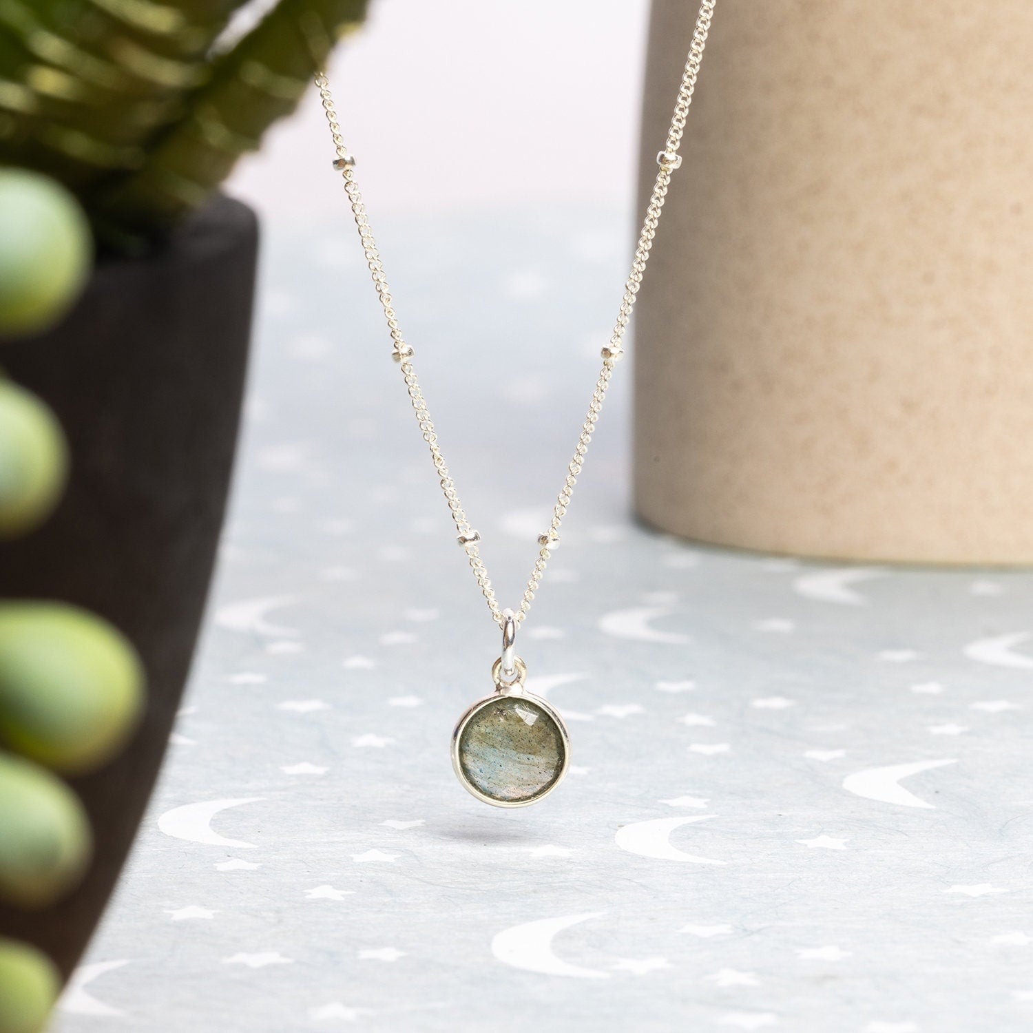 Round Labradorite Silver Necklace on Satellite Chain - Petite, dainty, sophisticated small circle labradorite gemstone - Mother's Day Gifts