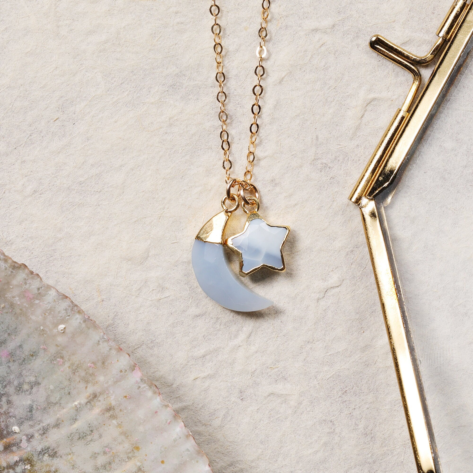 Blue Opal Moon and Star Necklace Genuine opal Moon Star Pendants on 14k Gold Filled Adjustable chain Gift idea for Mom, bridesmaids, bride